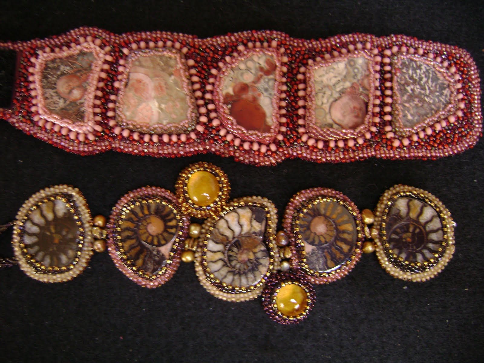 | copper, glass beads, ammonite |